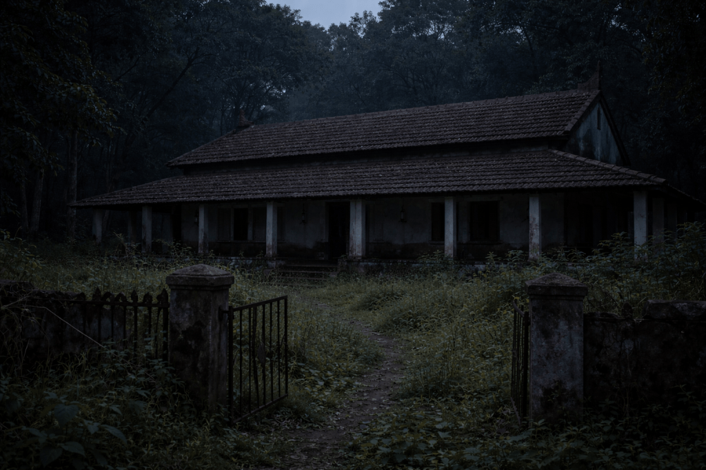 When he reached the main gate, he noticed it was rusted and slightly tilted. The compound looked neglected at the edges. Weeds grew where a path should have been, and the grass had a flattened look. The bungalow itself looked maintained and functional, but there were no lamps, no smoke, no hint that anyone actually lived there. Near the verandah steps, the air carried a distinct smell—metallic and damp—like wet iron kept in a closed room.