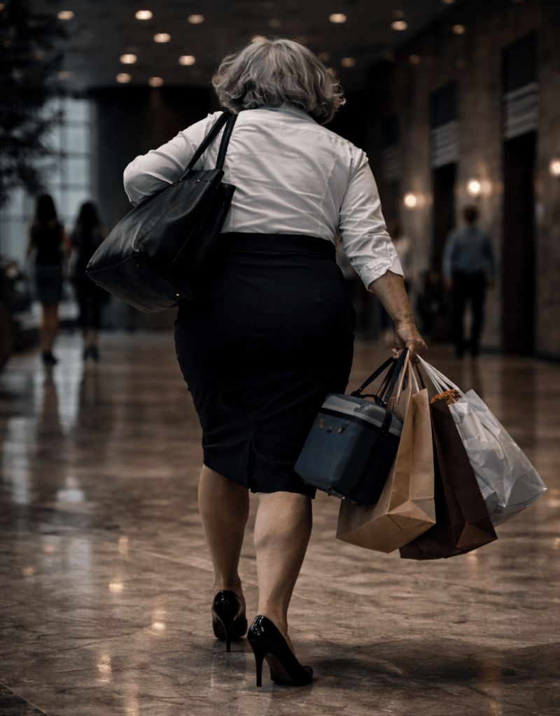 White shirt. Black skirt. Bags and packets looped over her arms. Hair cut into a neat bob. What made me notice first were her pencil heels. The sound cut through the lobby noise. I watched her cross the floor and found myself thinking, absurdly, don’t trip.